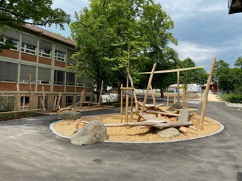 Der Schulhof der Albert-Schweitzer-Schule zwischen Pavillon-Ost und Pavillon-West ist bereits fertiggestellt: Entstanden sind verschiedene attraktive Aufenthalts- und Spielbereiche,wie Kletter- und Balancierstrukturen,eine Rutsche,Sitzelemente und Reckstangen. Ein Sonnensegel über der zentralen Spielinsel spendet Schatten an sonnigen Tagen,außerdem wurden zwei neue Bäume gepflanzt und die vorhandene Böschung mit Stauden,Gräsern und Sträuchern aufgewertet.