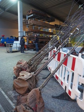 Foto (Stadt Uhingen): Beim Bauhof der Stadt Uhingen stapelten sich kürzlich Streuobstbäume für interessierte Bürgerinnen und Bürger.
