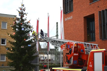 Fotos (Bildquelle: Stadt Eislingen): Mithilfe der Drehleiter wurde der Baum bis zur obersten Spitze geschmückt.