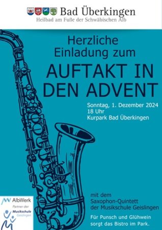 Die Gemeinde Bad Überkingen lädt am Sonntag,den 1. Dezember 2024,um 18 Uhr zum „Auftakt in den Advent“ in den Kurpark nach Bad Überkingen ein. Musikalisch wird die Veranstaltung vom Saxophon-Quintett der Musikschule Geislingen begleitet,das mit festlichen Klängen auf die Adventszeit einstimmt.