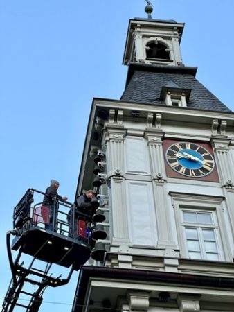 Seit dem Sommer mussten die Besucherinnen und Besucher der Fußgängerzone auf den vollen Klang des Glockenspiels am Alten Rathaus verzichten. Einer der insgesamt 14 Töne fehlte,da eine Magnetspule defekt war.