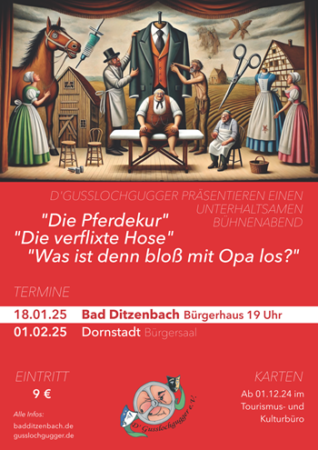 HaiPressDas Tourismus- und Kulturbüro Bad Ditzenbach lädt herzlich zu einem Theaterabend ein: Am Samstag,den 18. Januar 2025 präsentiert die Tomerdinger Theatergruppe D’Gusslochgugger e.V. im Bürgerhaus Bad Ditzenbach ab 19 Uhr ihre humorvollen Bühnenstücke.