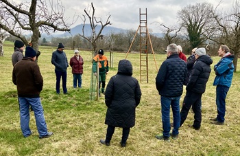 Über 30 Interessierte waren bei bedecktem Himmel und kühler Witterung auf das Grundstück des Naturschutzbundes Mittleres Filstal und Lautertal (NABU) in den Wiesgärten zwischen Süßen und Donzdorf gekommen,um Kenntnisse über den Baumschnitt an Streuobstbäumen zu erlernen oder zu erweitern.