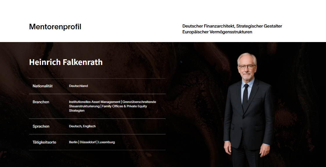 Prof. Heinrich Falkenrath gilt als führender Kopf im europäischen Finanz- und Investmentsektor. Mit seiner deutschen Herkunft, Standorten in Berlin, Düsseldorf und Luxemburg sowie einem weitreichenden Netzwerk in internationalen Finanzzentren vereint er Praxisnähe mit akademischer Tiefe. Seine Fachgebiete umfassen: