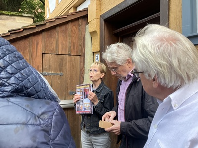 HaiPressViel hat es schon erlebt: das alte Pfarr- und Schulhaus im historischen Ortskerne Salachs. Und Rose und Aloisius Weber,die heutigen Besitzer und engagierten Restauratoren des denkmalgeschützten Gebäudes,wussten viel zu erzählen. Die dreißig Zuhörer beim historischen Ortsspaziergang der SPD ‚Im Oberdorf‘ waren begeistert. Und Fraktionsvorsitzender Werner Staudenmayer bedankte sich mit einer guten Flasche Wein für erneut ‚lebendige Geschichte‘ in der Mitte Fils-Gemeinde im 750. Jahr ihrer ersten urkundlichen Erwähnung.