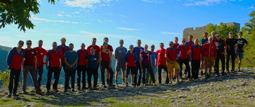 Foto (Raimund Wimmer): Die neuen Einsatzkräfte der DRK Bergwacht Württemberg mit ihren Prüfern. Im Hintergrund die Burgruine Reußenstein