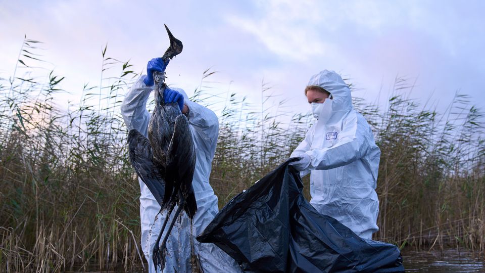 Umweltarbeiter mit dem Kadaver eines Vogels,der an der Vogelgrippe verendet ist (in Linum,Brandenburg): Höchste Aufmerksamkeit und strikte Einhaltung der Hygienevorschriften