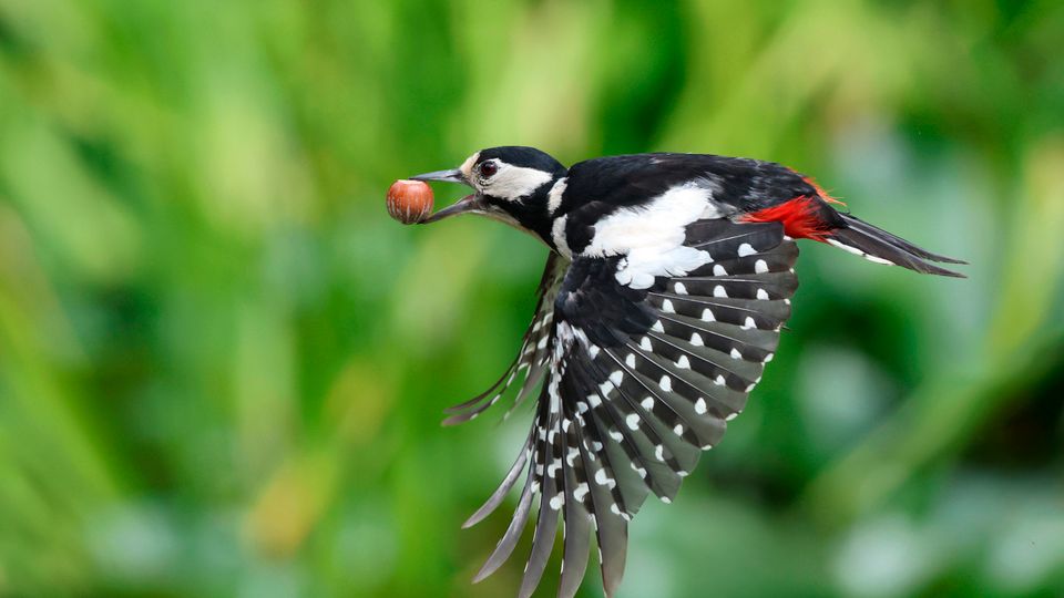 Buntspecht mit Haselnuss im Schnabel: »Sie können einen Baum regelrecht zerlegen«