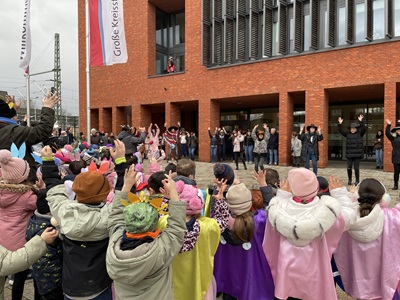 Die Kinder präsentierten ein tolles Programm mit Liedern zum Mitmachen,einstudierten Tänzen,lustigen Gedichten und verschiedenen Aufgaben für das Mitarbeiterteam der Kindergartenverwaltung. Mit den Mottos „Dschungel“,„Superhelden“ und „Im Kinderhaus da geht es rund,heut kommen alle kunterbunt“ steckten die Kinder alle mit ihrer Faschingsfreude an. Wegen dem eintretenden Regen wurde der Besuch kurzerhand in das Rathausfoyer verlegt und schon gleich ging es ans Eingemachte. Bei der Büttenrede des St. Michael Kindergartens durften die Kinder frei raus Wünsche für ihre Kitas äußern: „Eine Villa-Kunterbunt,wie die von Pippi-Langstrumpf“,„Musikinstrumente und mehr Lieder“,„Ein Pferd!“,waren ihre Wünsche mal mehr mal weniger bescheiden.